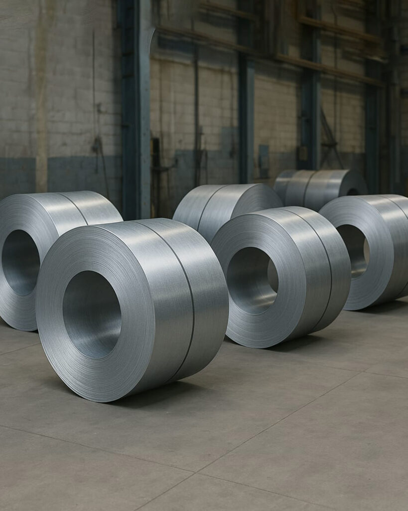 El proceso de fabricación de nuestras tazas, boles y platos esmaltados comienza con bobinas de lámina de acero que se cortan a la medida exacta según el tipo de pieza a producir.