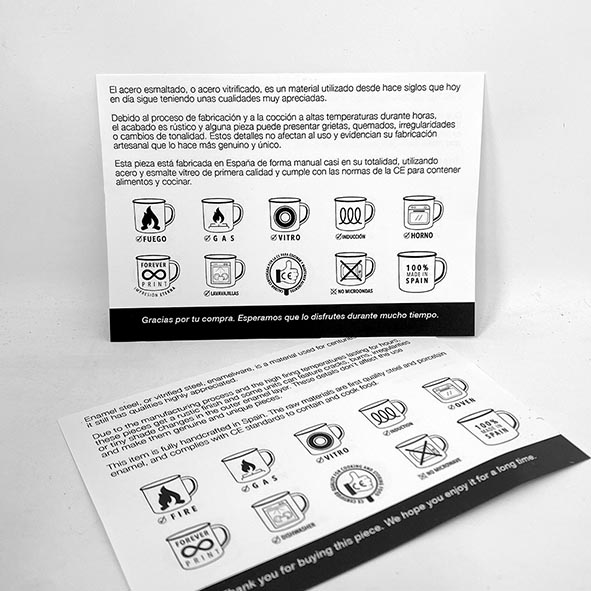 Las tazas RETROPOT son de acero esmaltado con recubrimiento de esmalte vítreo. Están diseñadas y fabricadas 100% en España, de forma manual casi en su totalidad, de la misma manera que se hacía hace casi 300 años.